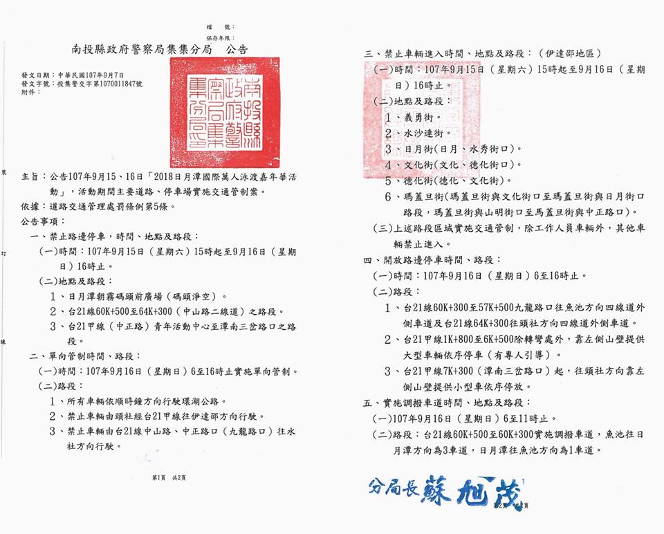 「2018日月潭國際萬人泳渡嘉年華活動」,活動期間主要道路、停車場實施交通管制 公告