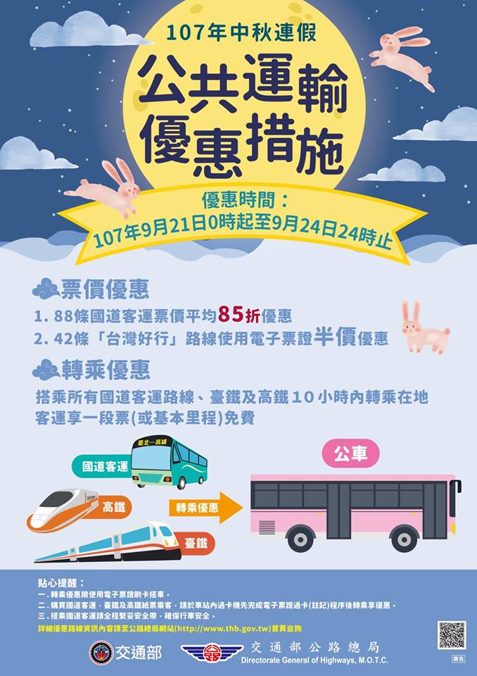 因應107年中秋連假疏運,交通部公路總局規劃多項公共運輸優惠措施,包括國道客運全票85折、臺灣好行半價及國道客運、臺鐵、高鐵使用電子票證轉乘在地客運折扣等,實施期間自107年9月21日0時起至107年9月24日24時止實施,歡迎民眾多加利用大眾運輸工具規劃返鄉旅遊行程。