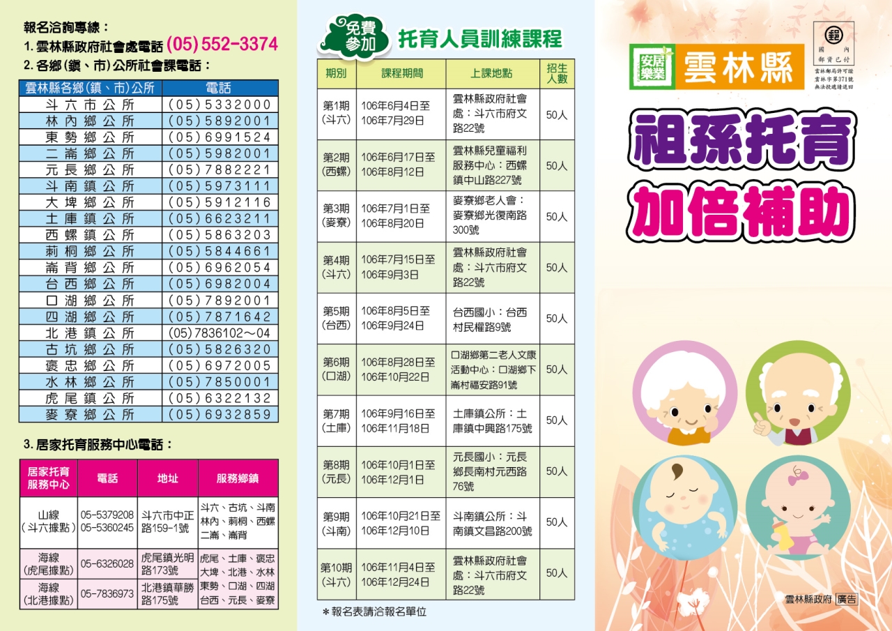 雲林縣政府開辦祖父母托育人員訓練課程共10班,分別於斗六、西螺、麥寮、台西、口湖、土庫、元長、斗南開課,報名時間自106年4月5日至106年5月19日止,詳情請上社會處網站或電洽社會處552-3374洽詢!